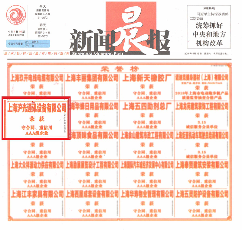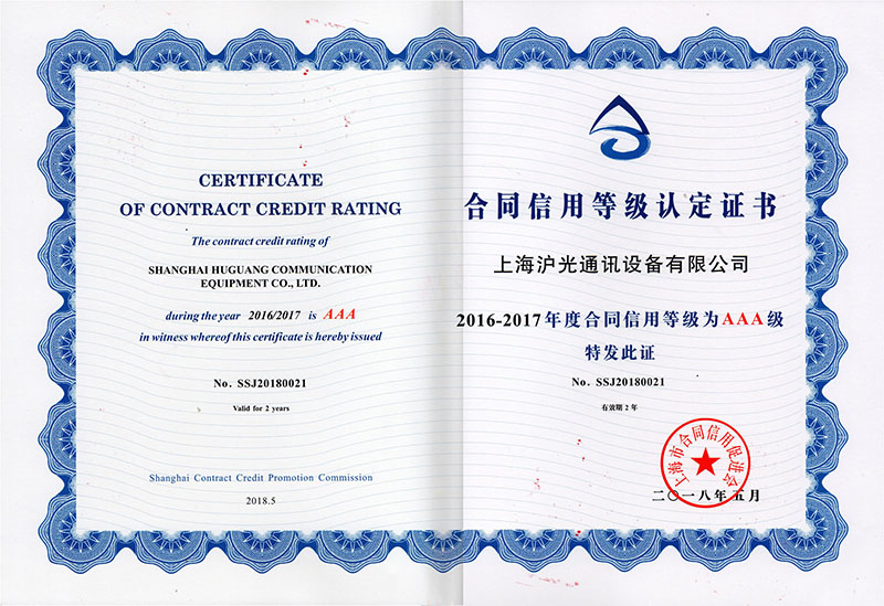 2018年,上海滬光通訊設備有限公司憑借良好的信譽和信用,再次被上海市工商局、上海市合同信用促進會認定為“2016-2017年度上海市守合同重信用企業(yè)”,合同信用等級為最高級別的AAA級。